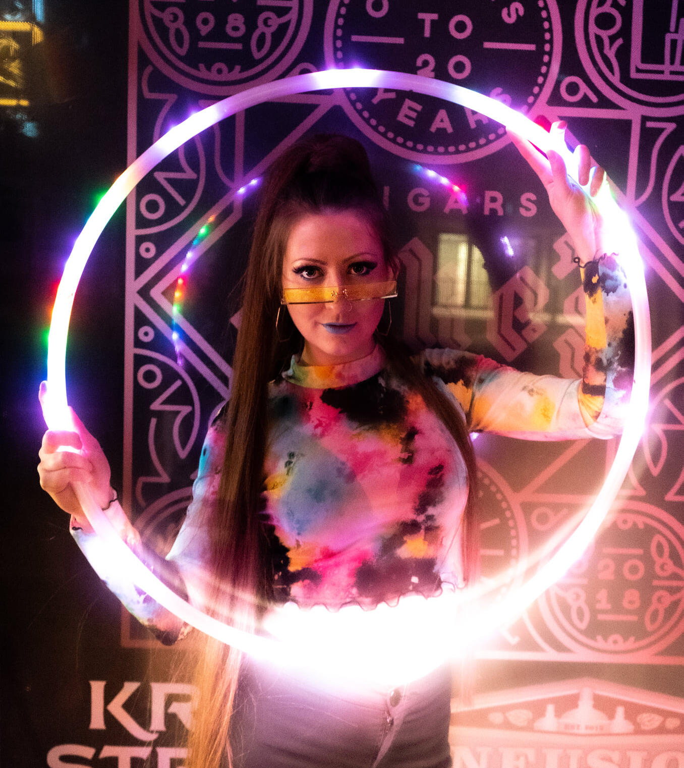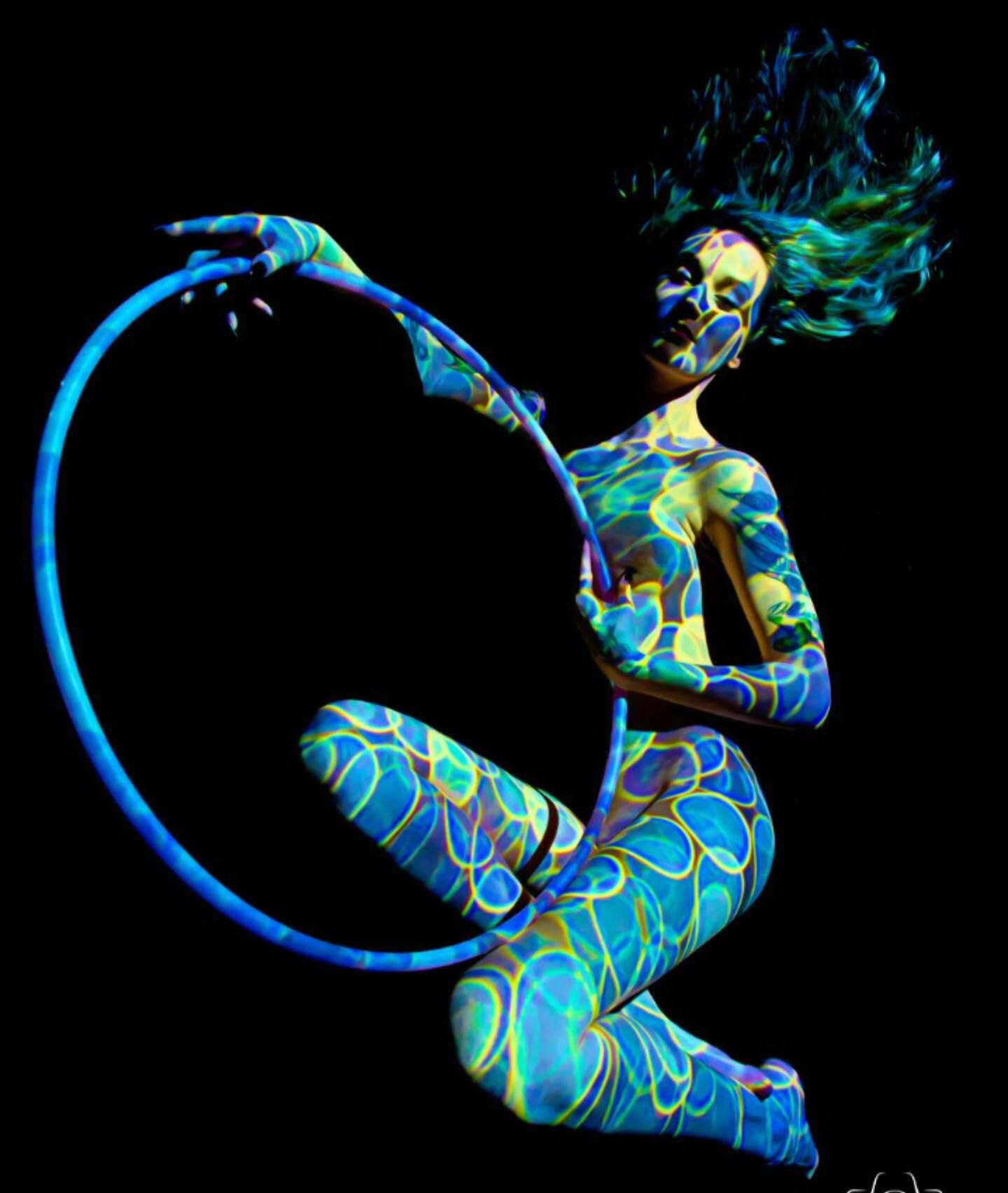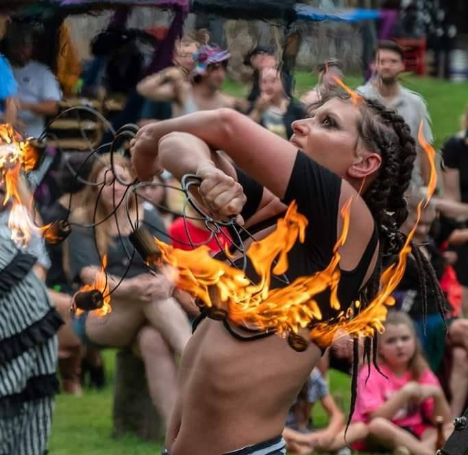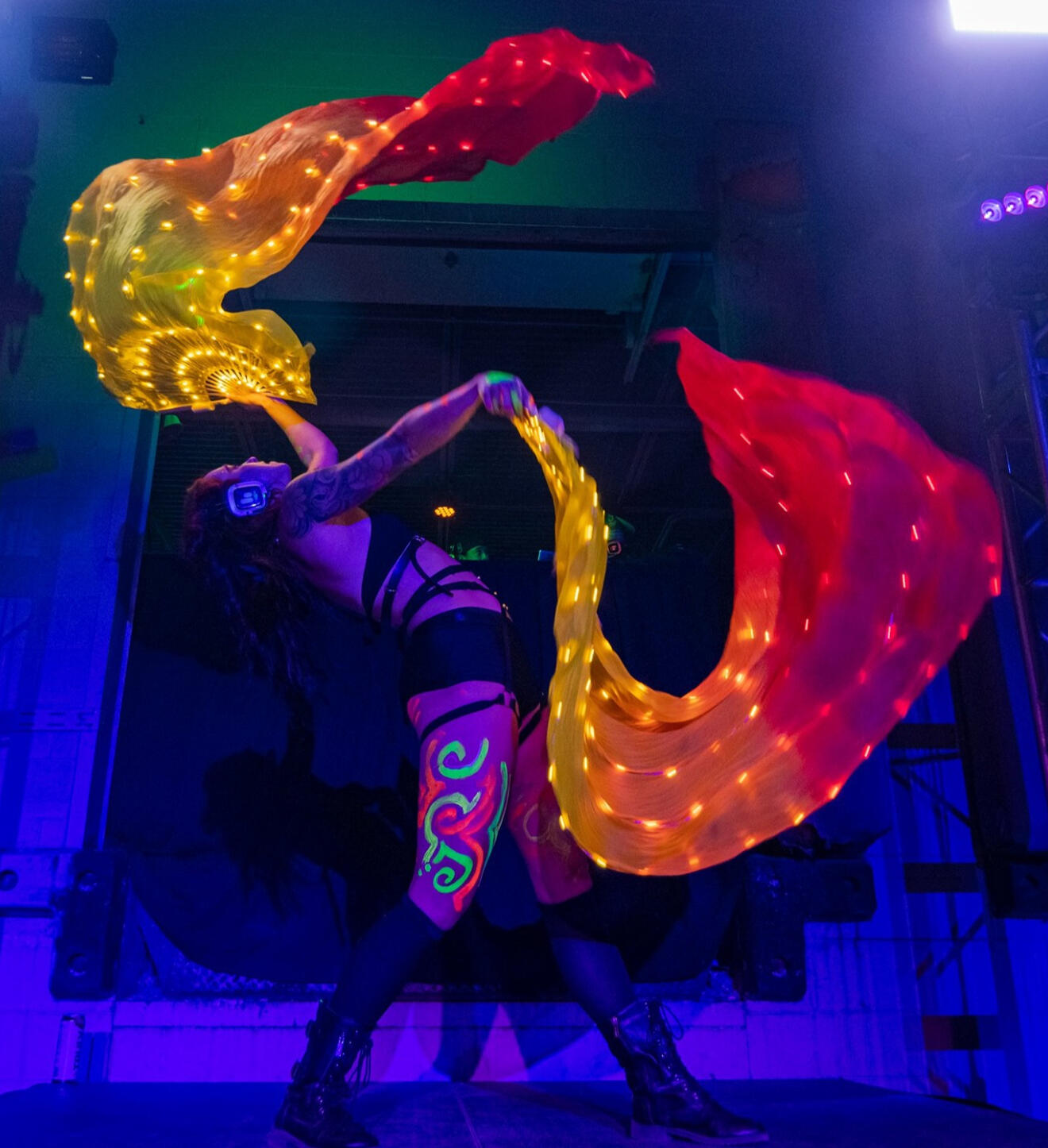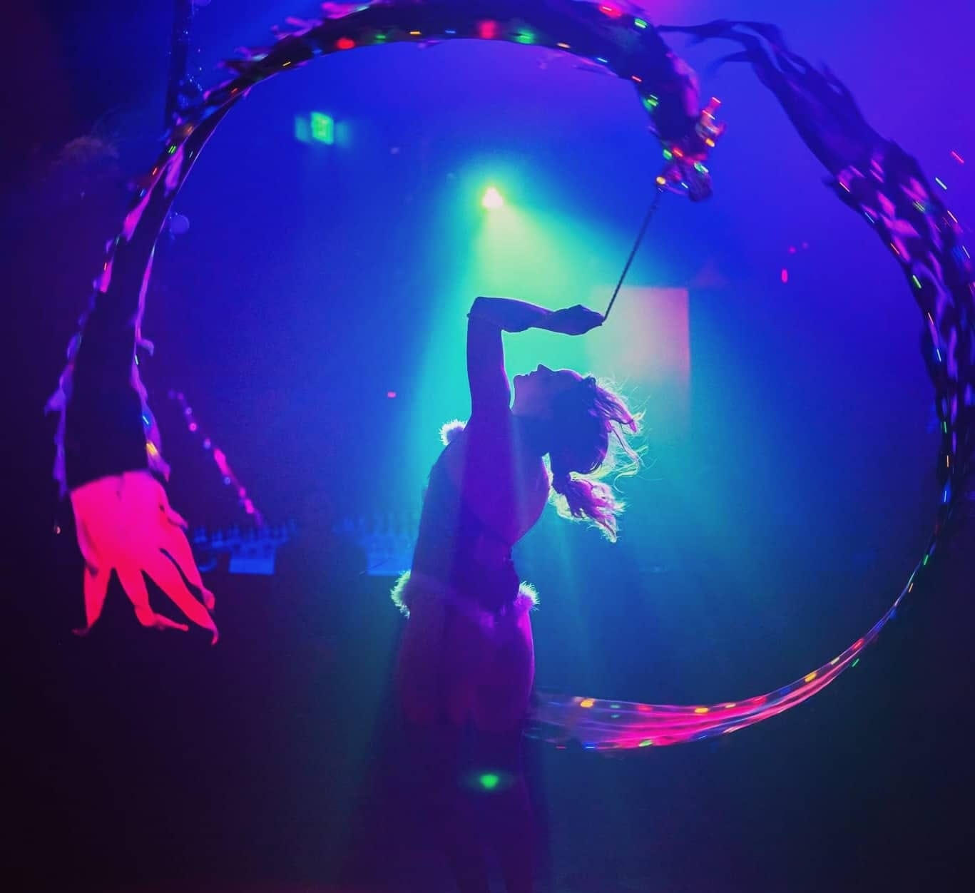 Dizzyraye aka Brittini Gottner r is a fiery blind performer out of Nebraska! You can find her flying through the air either solo or with a partner in her lyra or dropping, tumbling and spinning in her aerial hammock! But she doesn’t stop there! When she finds her feet on the ground , she is dancing and spinning thru the flames or lights of her sacred circle! Finding her home in her hula hoop!