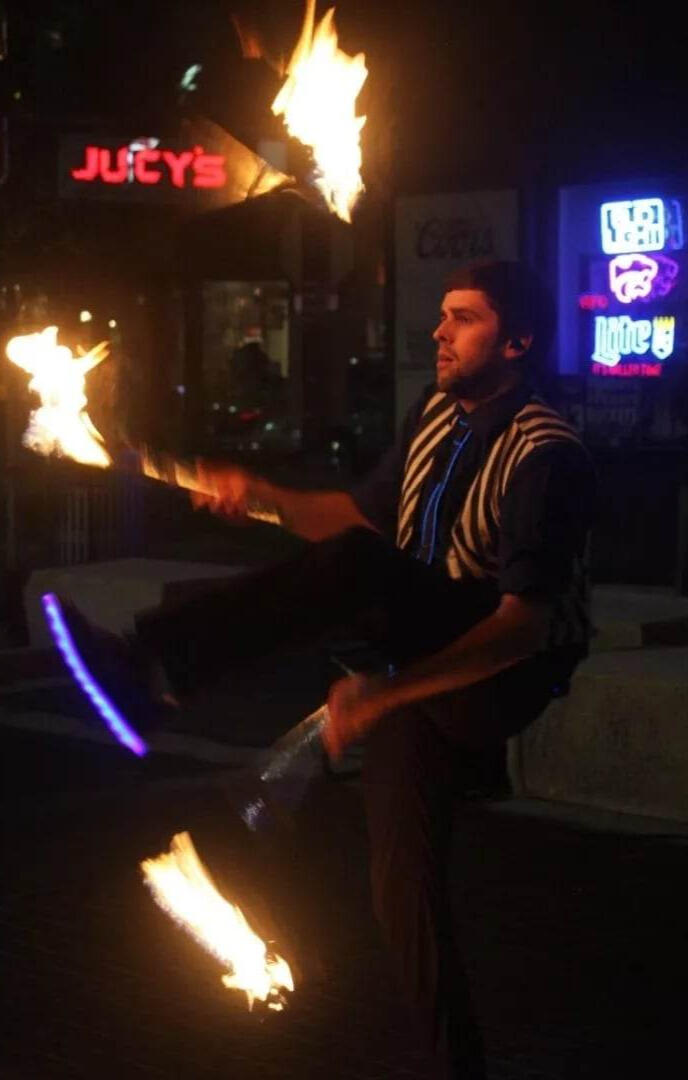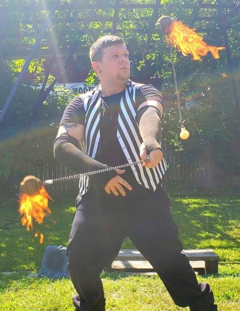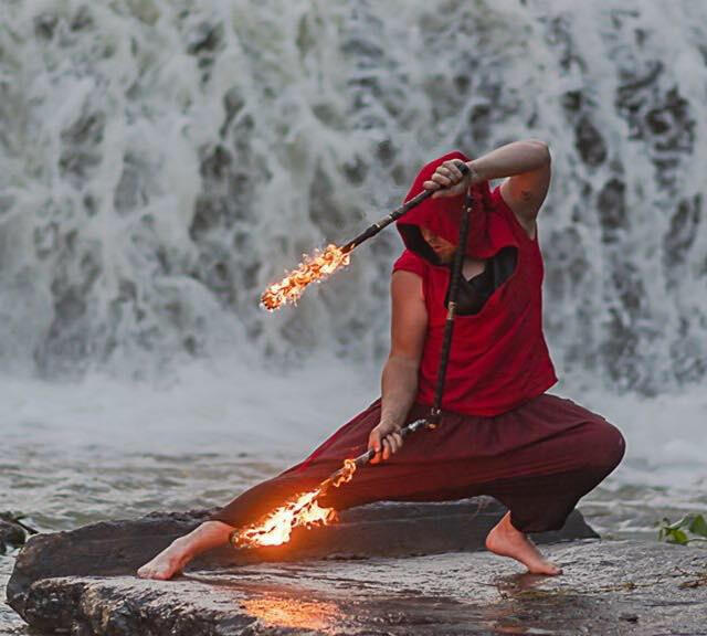 Norsefyre Troupe leader Colter Bowers is a lifetime martial artist who decided to run away and join the circus. He has toured as far as Beijing showing off his fire weapon proficiency. Most well known for his work with swords, he is also well versed in whips, rope dart, and the dreaded sanjiengun. When not rooted in the earth he is an experienced aerialist, specializing in dynamic beats and drops and partner acrobatics.