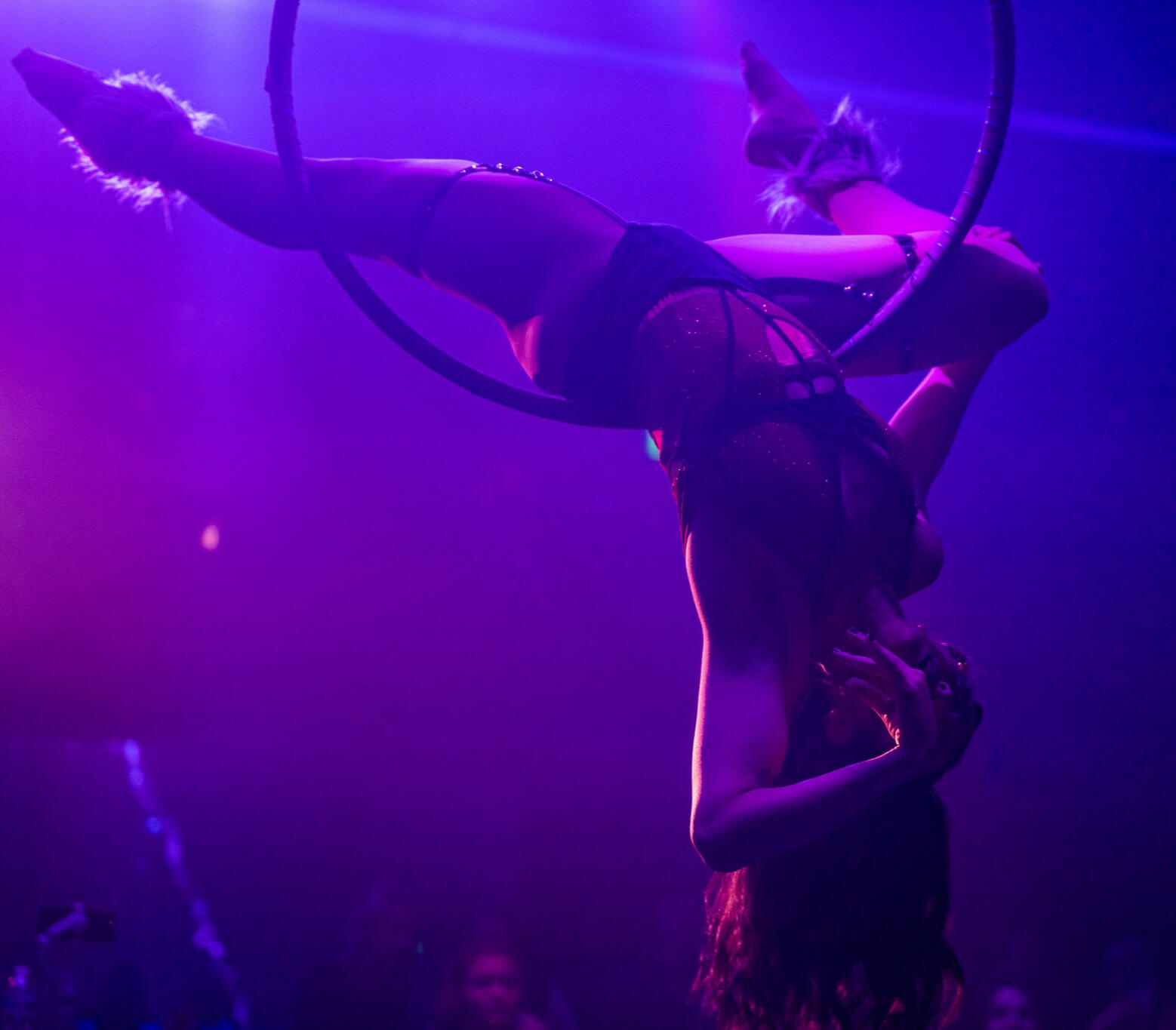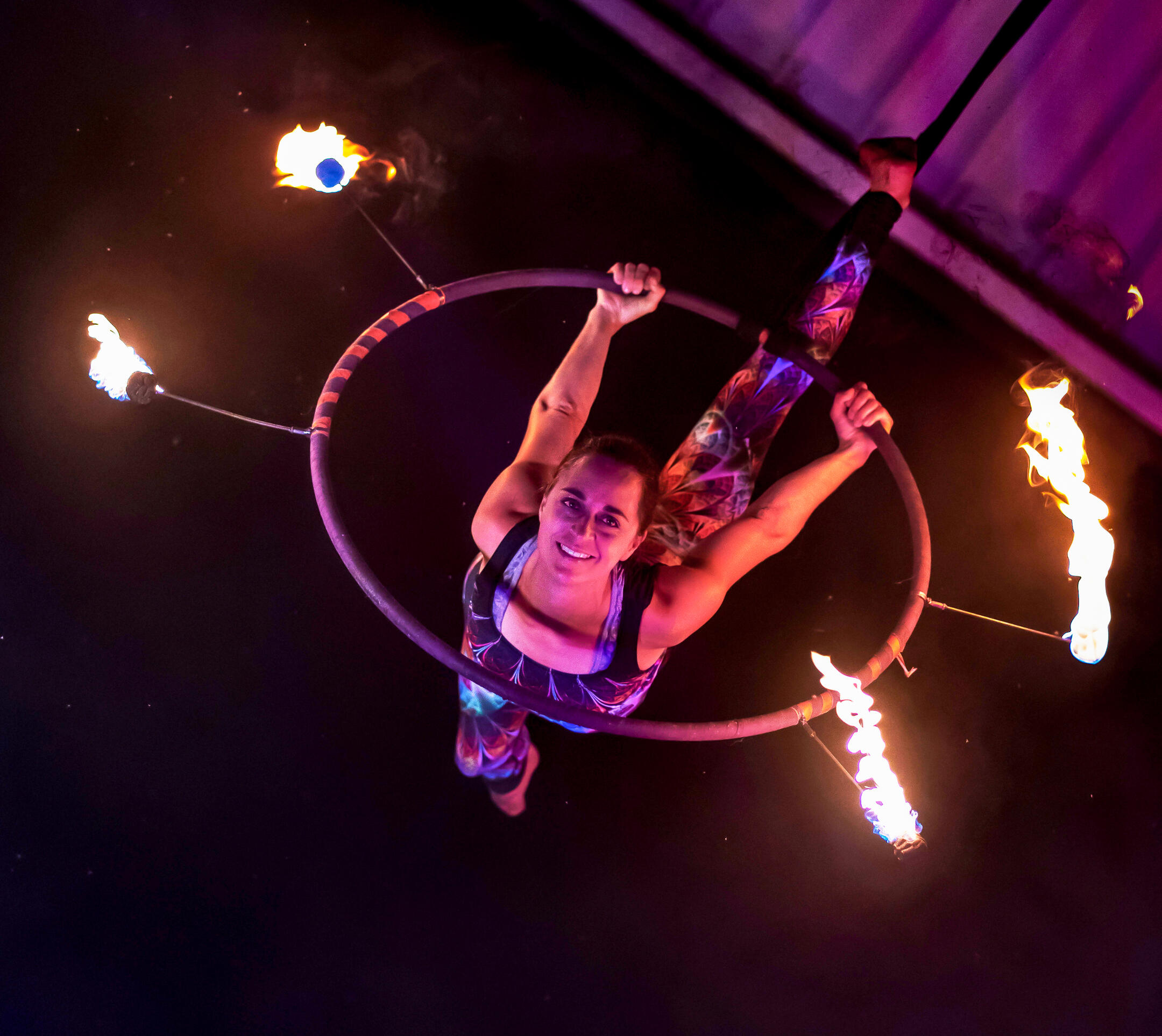 Katie is a high flying daredevil aerialist from Nebraska. She specializes in flips, tricks, and drops. She’s always looking for the next new daring trick. She is well versed in all aerial apparatuses but specializes in static trapeze and loves to create partner acts on hammock and Lyra. She also dabbles with fire and flow props.